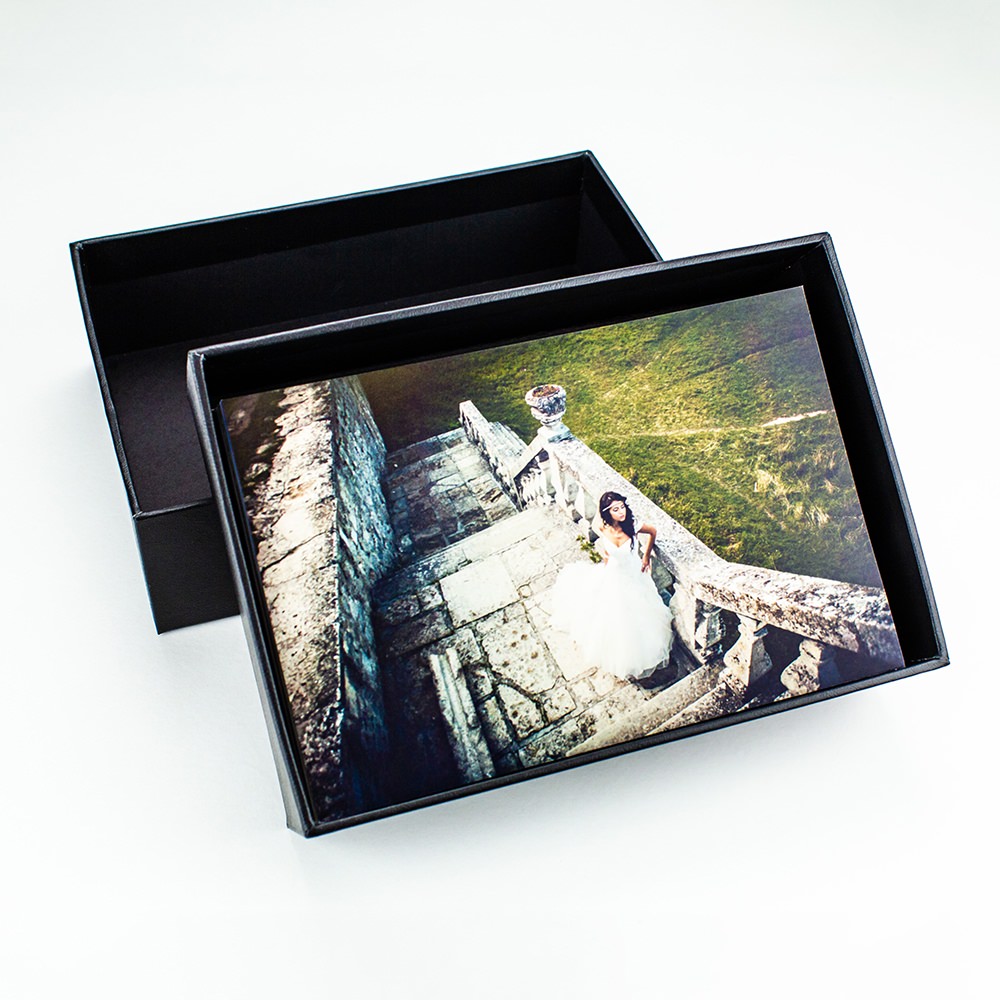 The Timeless is an excellent option for photographers looking to gift their clients their photographs in a unique way. This box holds up to 175 photographs total and is perfect for clients who can’t decide which photos to have printed. It is made of fine materials with matching interior and separated lid. This bulk box does not come with custom printing.